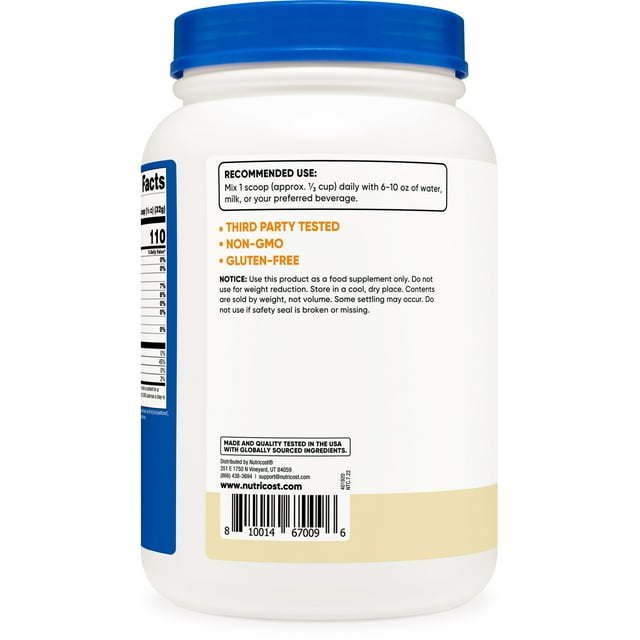 Nutricost Casein Protein contains 2 pounds of vanilla flavored micellar casein powder for 28 servings in each bottle. Each serving provides approximately 25 grams of protein. Micellar Casein is derived from dairy and is a slow-digesting protein. Nutricost is located and headquartered in the USA. They only use the best ingredients to ensure maximum quality and to help you feel your best! By keeping our supplement recipes simple and clean, you get the best experience possible with Nutricost. Our supplements are manufactured in a GMP-compliant and FDA-registered facility; and each batch of every product is tested by independent, ISO-accredited laboratories. These statements have not been evaluated by the Food and Drug Administration. This product is not intended to diagnose, treat, cure, or prevent any disease.
