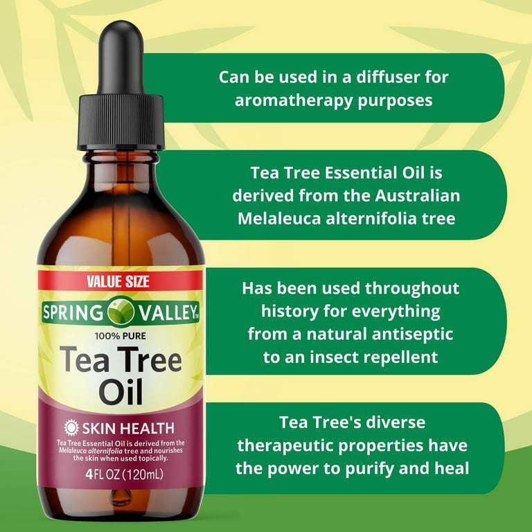 Spring Valley 100% Pure Tea Tree Oil for Skin Health, Liquid Supplement, 4 fl oz Spring Valley 100% Pure Tea Tree Oil for Skin Health, Liquid Supplement, 4 fl oz Spring Valley 100% Pure Tea Tree Oil for Skin Health, Liquid Supplement, 4 fl oz Spring Valley 100% Pure Tea Tree Oil for Skin Health, Liquid Supplement, 4 fl oz Spring Valley 100% Pure Tea Tree Oil for Skin Health, Liquid Supplement, 4 fl oz